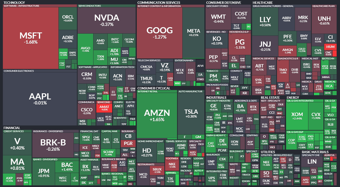 6 of 11 sectors closed green. Energy (+2.10%) led, & technology (-0.21%) lagged.