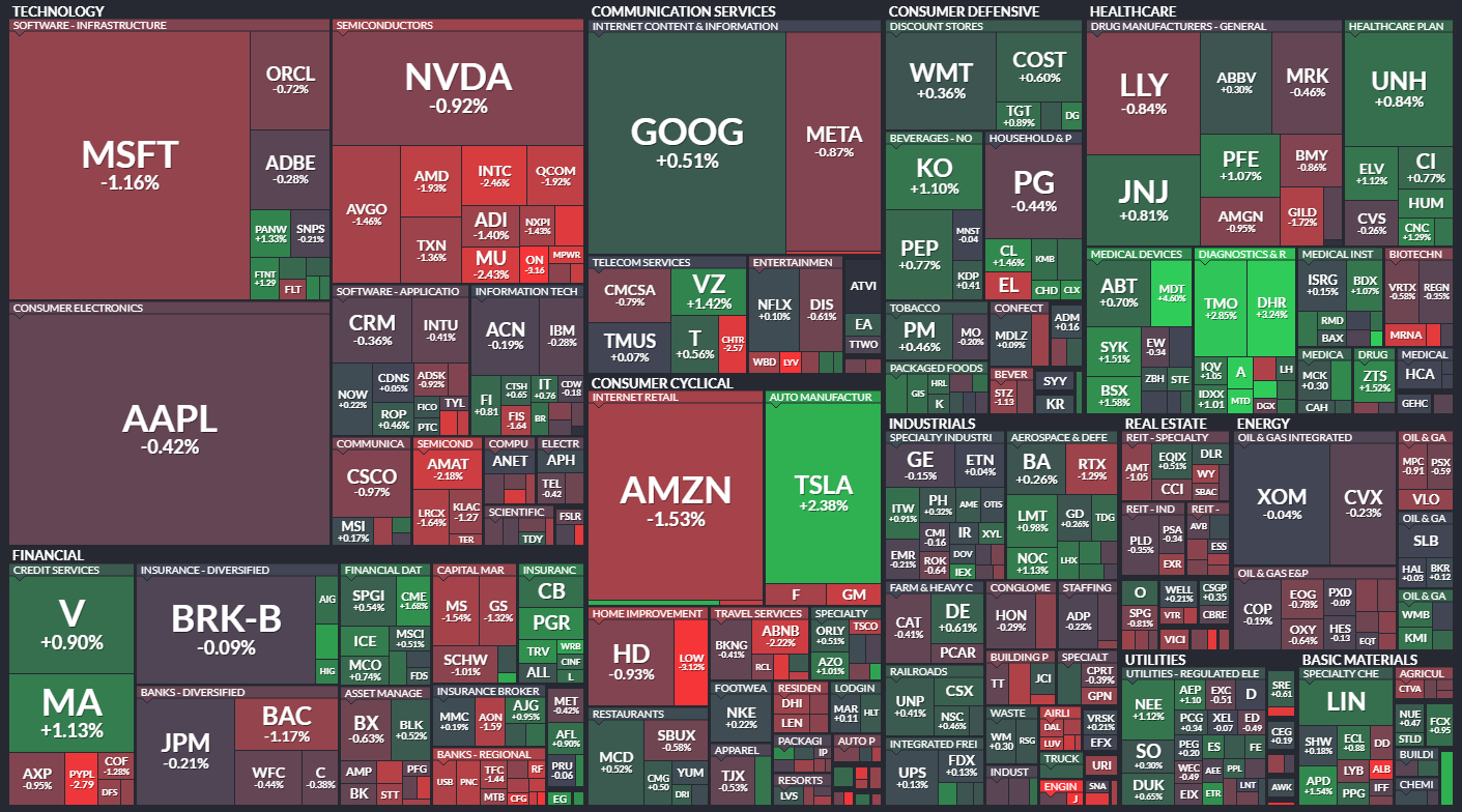 4 of 11 sectors closed green. Healthcare (+0.59%) led, & technology (-0.82%) lagged.