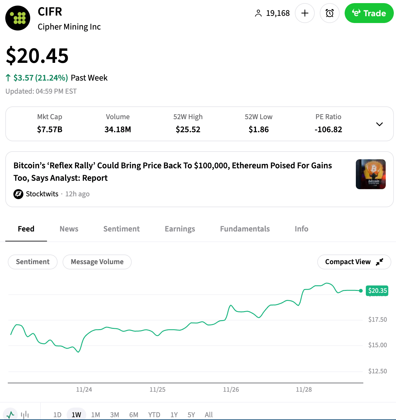 Cipher Mining’s stock gained more than 7% in morning trade on Friday, while Terawulf’s stock rose more than 5.5%. On Stocktwits, retail sentiment around CIFR remained in ‘bearish’ territory amid ‘low’ levels of chatter over the past day, and retail sentiment around WULF was in the ‘bullish’ zone, with chatter dipping to ‘low’ from ‘normal’ levels.