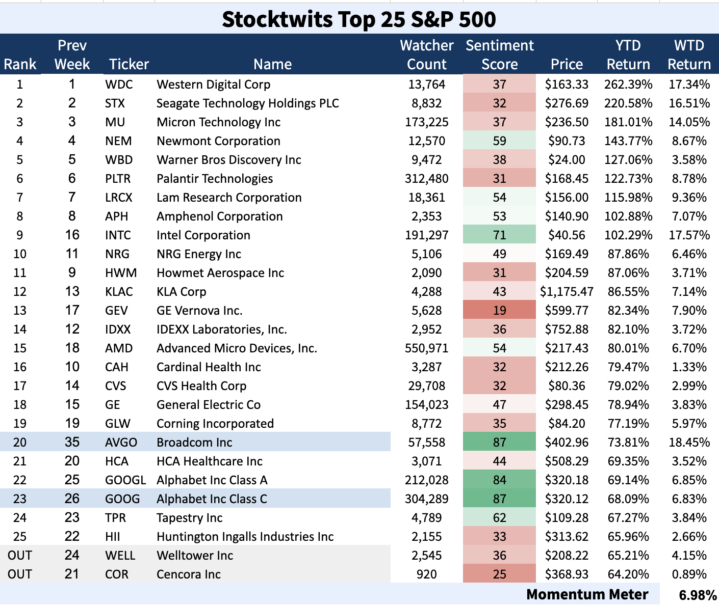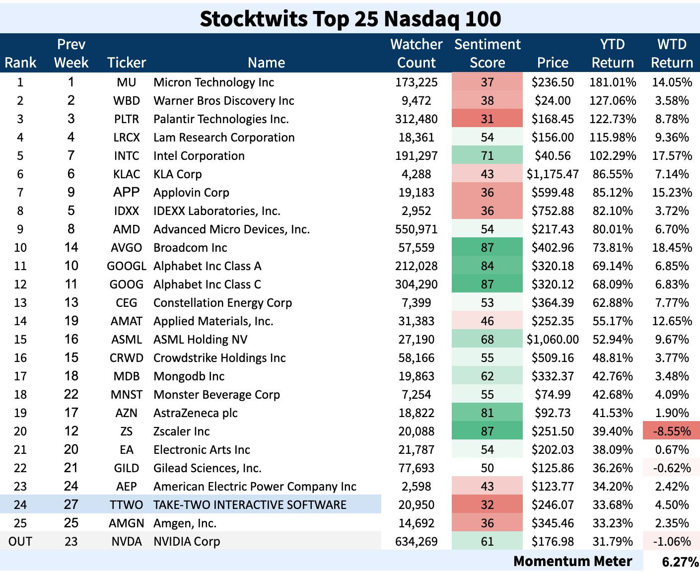 The Stocks Top 25 reports the 25 best-performing stocks in the S&P 500, Nasdaq 100, and Russell 2000 year to date (YTD) and tracks their performances over time. To help you understand this data further, check out our FAQ page, and feel free to reach out if you have questions!