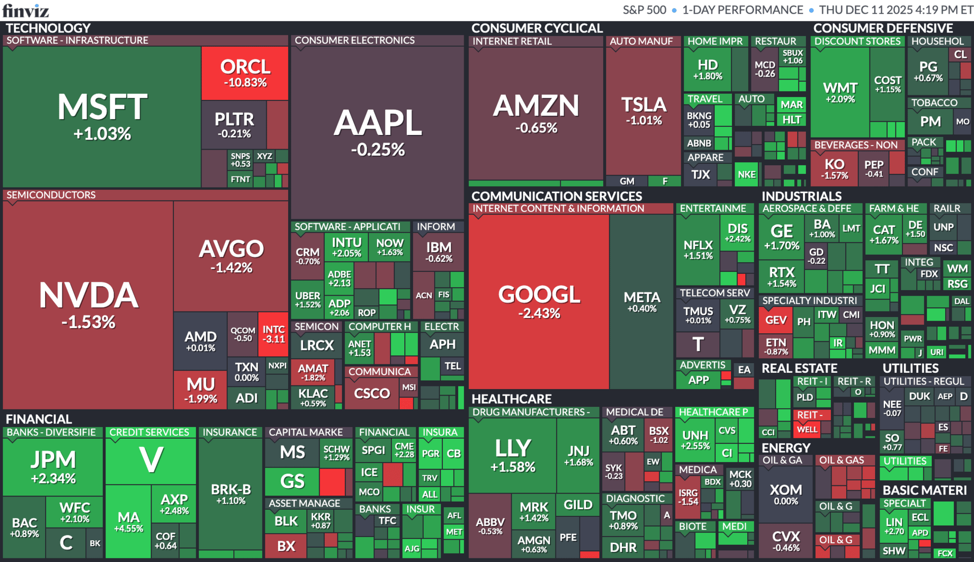 The tech news pulling the sector in the red was a story of exhaustion. Oracle was the most recent victim, reporting Thursday results near and above estimates, only to fall. The software giant showed 34% growth in cloud revenue to like $8B, but to fufill its $500B order book, it needs to build 30 data centers, FAST. It’s taking on loads of debt, and its earnings reaction yanked tech lower Thursday as traders asked themselves, do we really believe them?